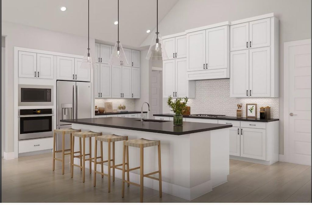 The Brentwood Plan - Welcome to this inviting one-story home featuring 5 bedrooms and 4 baths, with a spacious foyer that opens to a bright great room and chef-inspired kitchen. The kitchen offers a large center island, ample counter space, a walk-in pantry, and a prep kitchen, ideal for entertaining and everyday convenience. The open-concept layout seamlessly connects the kitchen, dining area, and great room. Additional highlights include a private home office, well-appointed laundry room, and a luxurious primary suite with dual vanities, a large walk-in closet, and spa-like bath. Enjoy relaxing evenings on the covered patio with peaceful views and beautiful sunsets.