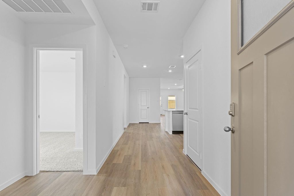 Welcome to the Kingston floor plan in Lago Mar! This single-story home offers 4 bedrooms, 2 bathrooms, and a 2-car garage, spanning 2,031 sq. ft. Upon entry, you'll find two secondary bedrooms and a bathroom near the foyer. Each bedroom features a bright window and a tall closet, while the bathroom includes vinyl flooring, a linen nook, and a tub/shower combo. The open-concept family room, dining room, and L-shaped kitchen are perfect for hosting. The kitchen is equipped with extra counter space, a kitchen island, a tall pantry, and stainless-steel appliances. The utility room, behind the kitchen, offers space for a washer, dryer, and storage. The last secondary bedroom, across from the kitchen, also includes a tall closet and a bright window.
