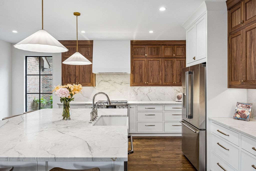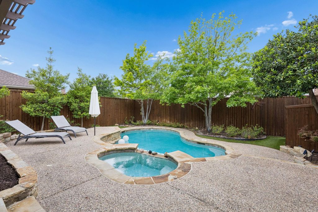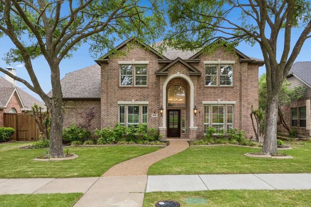 Fully updated inside and out with designer finishes throughout, this timeless traditional home is framed by gorgeous, mature landscaping, including a canopy of trees and expansive garden beds perfect for your flower gardens. Kitchen just updated that includes custom walnut illuminated cabinetry, integrated walnut appliance garage, Bianco Superior honed quartzite, Fireclay farmhouse sink, Dacor professional dual range, Profile stainless insert range hood, Waterdrop RO water filtration system. The private owner’s suite, tucked away downstairs, offers a serene retreat. Beautifully updated primary bathroom includes frameless shower, tub and bidet. Sparkling saltwater pool and attached spa, and enjoy ample space for entertaining in the outdoor living room with a built-in cooking center and fireplace. Pentair color LED pool lighting. Other updates include a newly resurfaced pool with a new pump and heater which have wifi capability, HVAC units, tankless water heater, security cameras, and enhanced backyard landscaping. Turf in the backyard. EV charger 220 plug in garage. Handscraped hardwoods on first floor just re-sanded and polished and new carpet throughout second floor. Walking distance to exemplary Tom Hicks Elementary. Neighborhood pool, park, walking trails and lakes and membership to Lakes Tennis Academy!