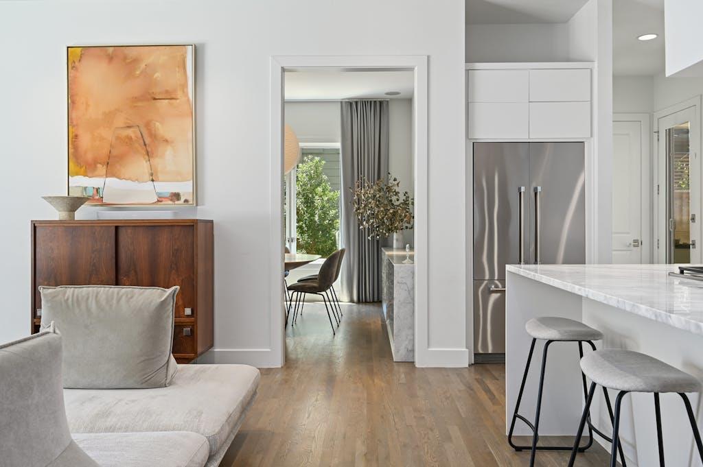 Upon entering, you are greeted by a sense of sophistication and refinement, with high ceilings and an abundance of natural light. The expansive kitchen is an ideal culinary retreat and gracious hosting space, featuring high-end appliances, ample counter space, and a seamless flow into the living area. Equipped with accordion glass doors, this space effortlessly transitions into an indoor/outdoor entertaining space. Situated on the main level, the primary bedroom offers a peaceful sanctuary, complete with a luxurious en-suite bathroom and generous closet space.