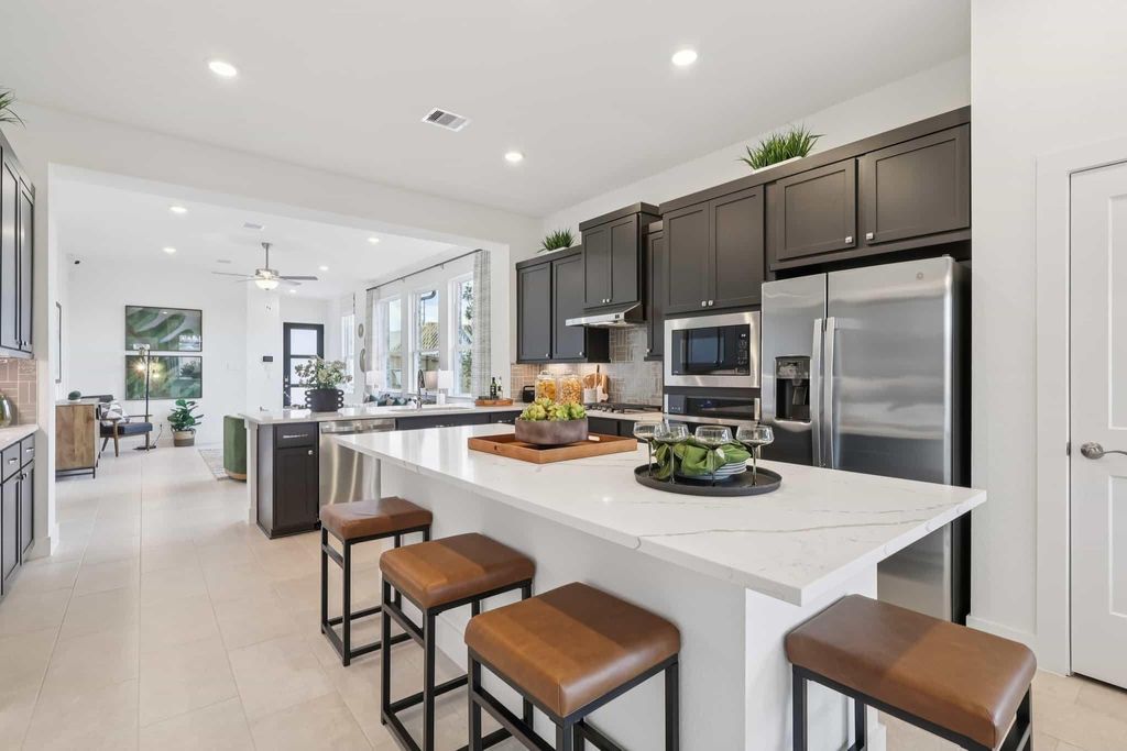 The Adele plan is a Boasting Single Story featuring 3 Bedrooms, 2 Bathrooms, Covered Rear Patio + 2 Car Garage. Spacious, Quartz Island Kitchen is Centrally located featuring Dual Eating Bars. Large Family Room and Casual Dining overlooking Rear Patio. Separate Main Suite makes for a more Private Feel, offering Attached Bath with Dual Sinks, Large Shower, Linen Storage, & Walk-in Closet. GE Stainless Steel Appliances, 2” Blinds, Auto Garage Door Opener, Security System, Sprinkler System, Fully Sodded Yard + Landscaping Pkg all included! This home will be ready Mid Summer, just in time to enjoy and relax in the Lazy River Pool or the Lagoon in the Master Planned Community of Sunterra in Katy, Texas.