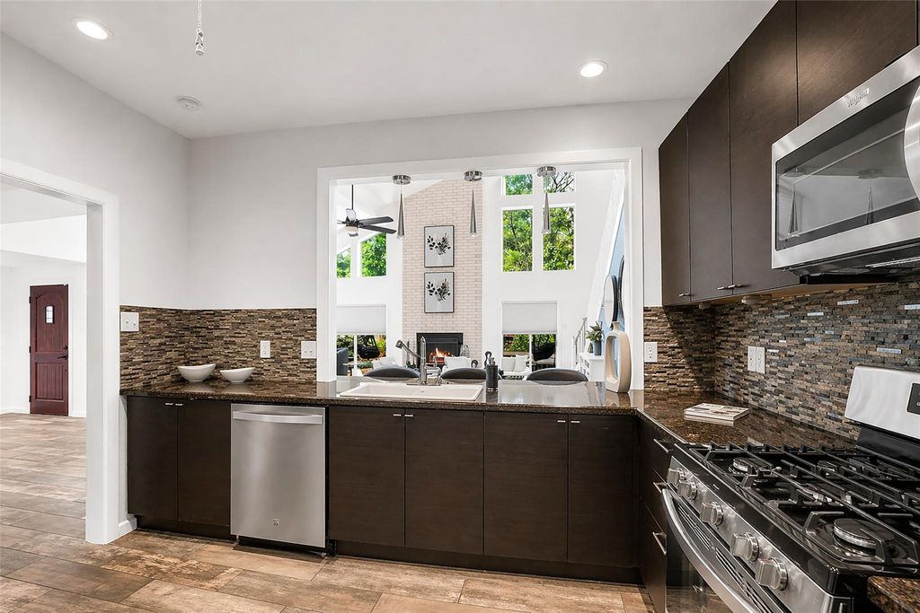 The home offers approximately 3,143 square feet of living space with three bedrooms and two baths. The spacious layout seamlessly integrates the indoors and outdoors, providing abundant natural light and a peaceful wooded setting. The living/dining area features a sophisticated color palette and a cozy fireplace, creating a warm, inviting atmosphere. The kitchen has stainless steel appliances, ample cabinetry, and a granite countertop. The first-floor primary bedroom has ample storage and a spacious ensuite bath featuring a modern vanity, soaking tub, double sinks, separate shower. Secondary bedrooms and bath upstairs have access to a large walk-in closet/storage area. Outside the home, a brick exterior, vinyl siding, and lush greenery are evident. The spacious outdoor area provides an opportunity to entertain on a warm summer evening or simply take in the wooded landscape. Overall, this home offers a harmonious blend of style, functionality, and a peaceful natural setting.
