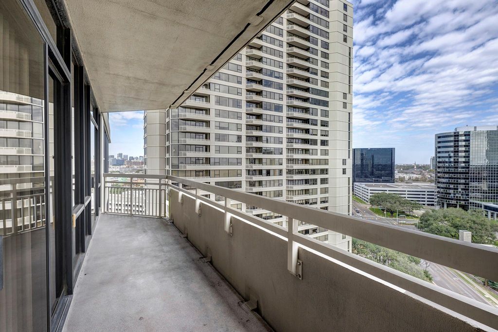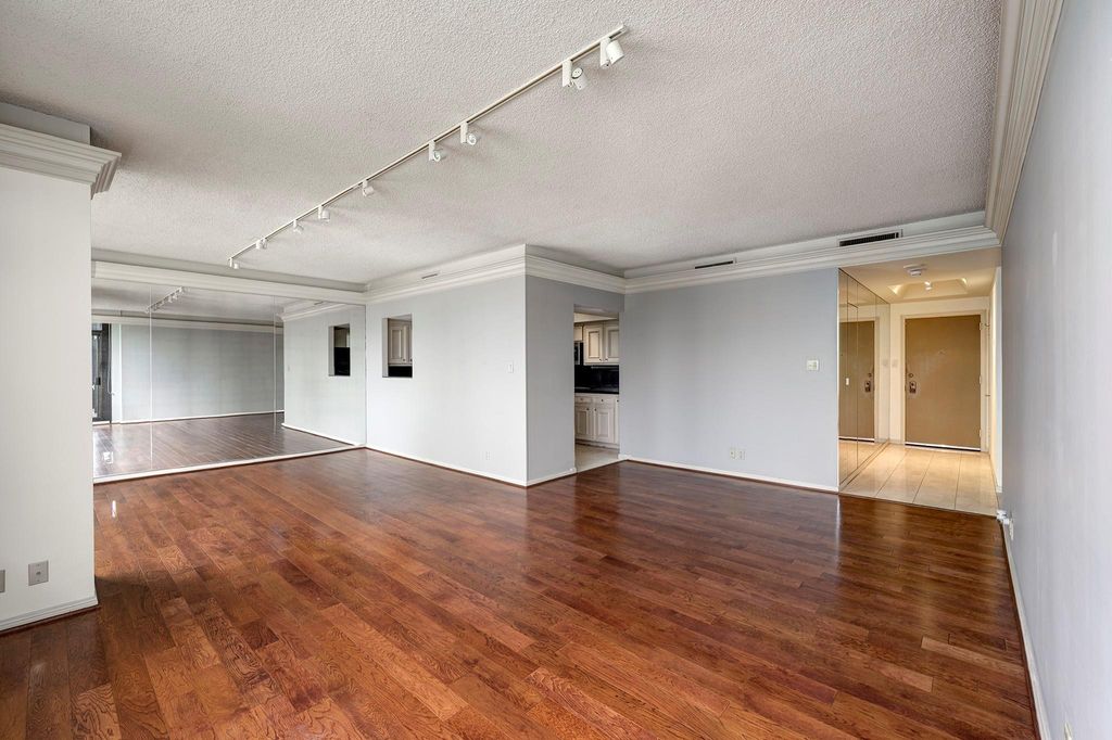 Spacious 14th-floor 2BR/2BA unit with wraparound balcony and expansive views. Wide-plank hardwood floors in living and dining areas with neutral tones, crown molding, cove lighting, and solar shades. Travertine floors in entry, kitchen, and hallway. Kitchen features stainless steel appliances. Primary suite includes custom walk-in closet system and full wall of built-in cabinetry. Full-service high-rise in convenient central location with doorman, valet, porter, heated pool, and more. Close to restaurants and a health club!