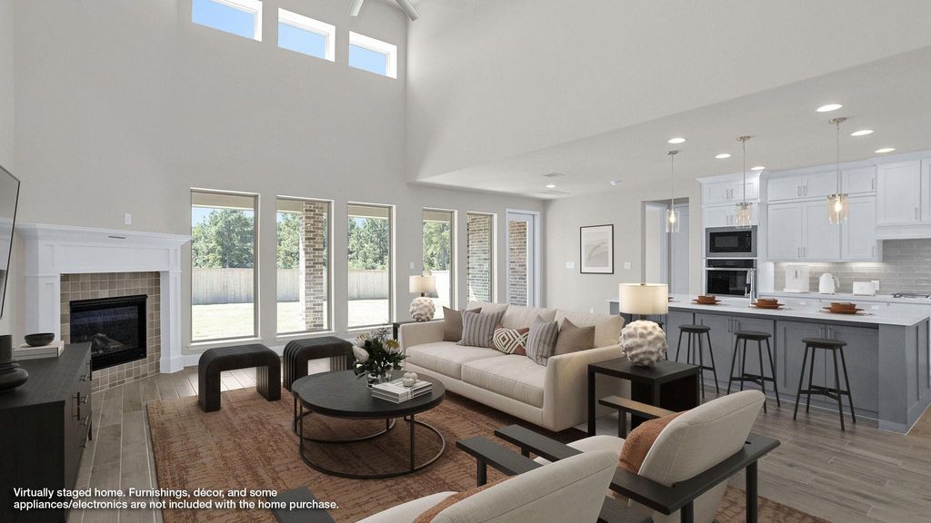 READY FOR MOVE-IN! Two-story entry highlights curved staircase. Home office and formal dining room frame entry. Kitchen and morning area open to two-story family room with corner wood mantel fireplace and wall of windows. Kitchen features walk-in pantry, Butler's pantry, 5-burner gas cooktop and generous island with built-in seating space. First-floor primary suite includes bedroom with curved of wall of windows. Dual vanities, freestanding tub, separate glass-enclosed shower and two walk-in closets in primary bath. First-floor guest suite with private bath offers view of backyard. Upstairs highlights a media room, game room and Hollywood bath. Extended covered backyard patio. Mud room off three-car garage.