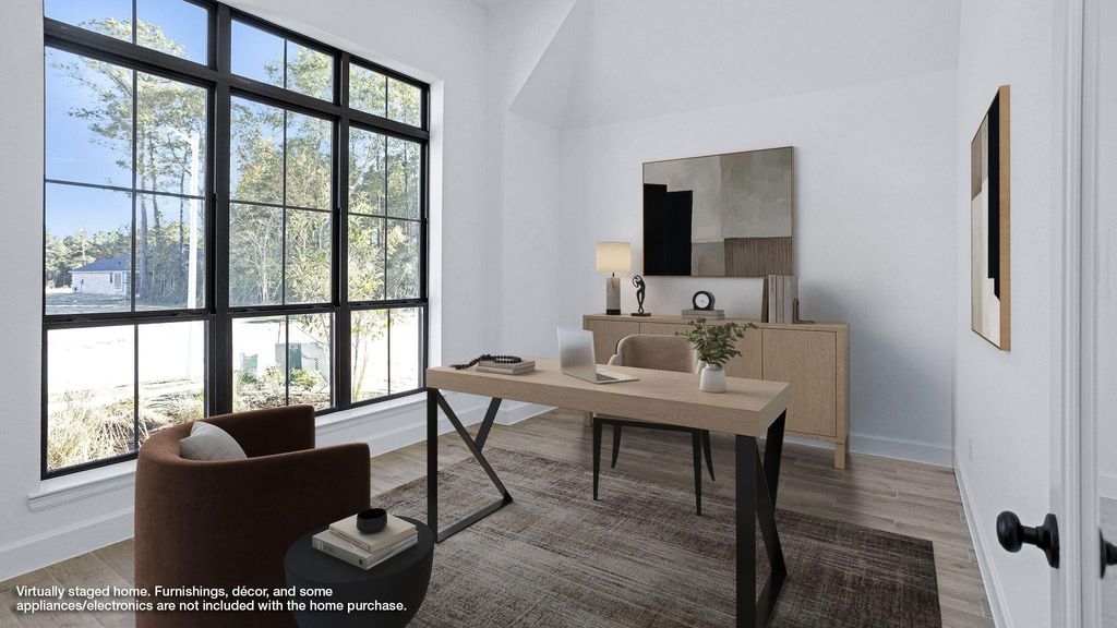 READY FOR MOVE-IN! A welcoming front porch opens into an extended entryway boasting a 12-foot ceiling. French doors open into the private home office which features three large windows. Down the hallway you pass the secondary bedrooms which feature walk-in closets and a shared bathroom. As you step into the dining area you are greeted with ample natural light. The family room boasts a wall of windows and tall ceilings. The kitchen hosts an island with built-in seating and a corner walk-in pantry. The primary bedroom hosts three large windows and convenient access to the utility room. The primary bathroom has dual vanities, a garden tub, glass enclosed shower, a linen closet, and two walk-in closets. Completing the floor plan is a guest suite with full bathroom and walk-in closet off of the main hallway. Covered backyard patio. Mud room is off of the two-car garage.
