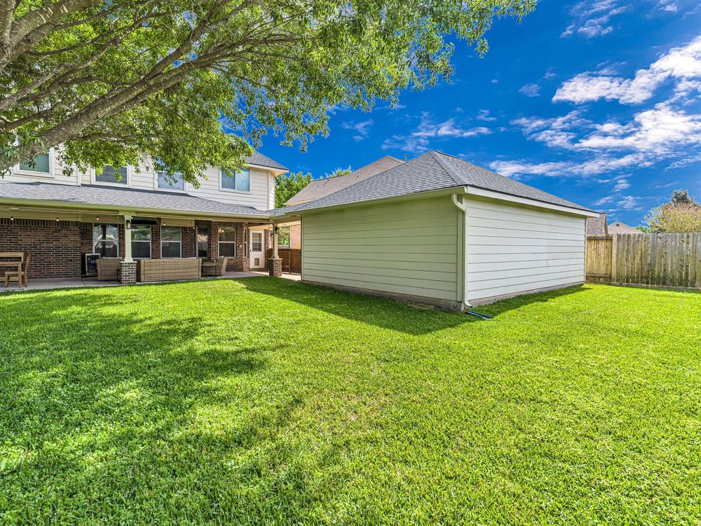 YOUR NEW HOME AWAITS in highly desirable Falcon Ranch. Amazing location & NO REAR NEIGHBORS! Gorgeous 2 story 5-bedroom, 3.5 bath family home is freshly painted. Great layout, beautiful mahogany floors in entry, LR, DR, staircase. Recently refinished front door. Dining Room and office flank 2-story entry. Bright island kitchen, granite counters, 42” cabinets, open to family room & pass-thru to formal DR. Abundant natural light, ceiling fans, art niche, sprinkler system, gutters, reverse osmosis system, water softener. SMART Programmable thermostat. Private owner’s retreat w/ en-suite bathroom, dual sinks, vanity, separate shower, jetted garden tub. Walk-in closets. Upstairs: spacious bdrms, game room, & a loft. Carpet upstairs. Huge, covered patio with 3 ceiling fans, Oversized detached garage. Amenities: pool, splash pad, clubhouse, lighted tennis courts, parks, walking trails. Close to LaCenterra, schools, dining, shopping, & more. Easy access: 99, i-10, Westpark Toll. WELCOME HOME!