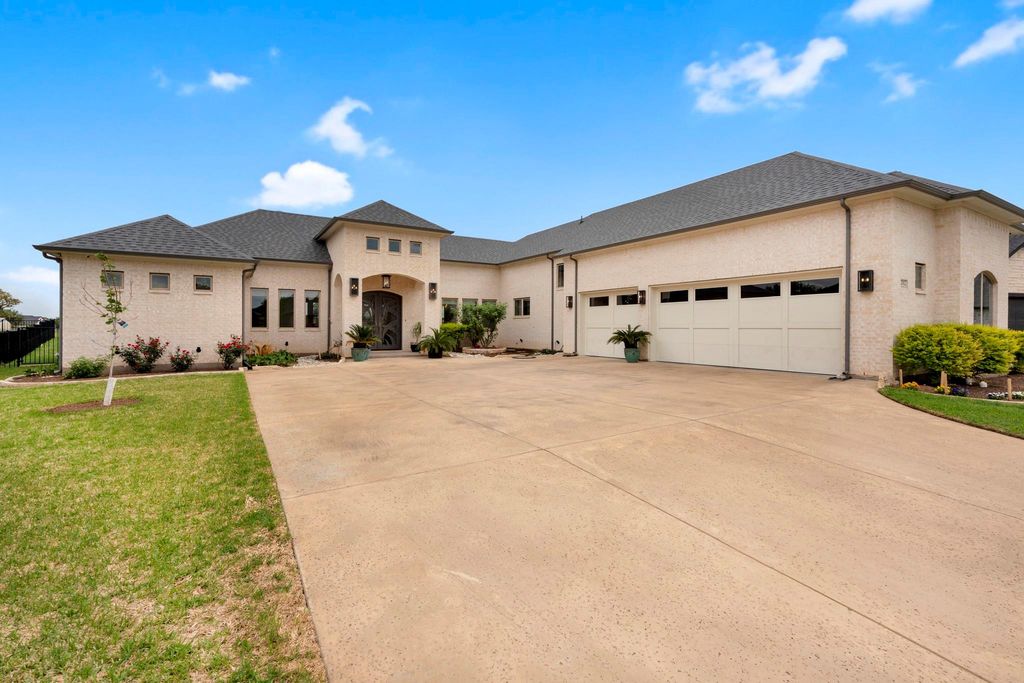 Welcome to Luxury Living in the Heart of Harbor Lakes! Nestled behind the gates of the prestigious Harbor Lakes community, this stunning golf course residence commands attention from the moment you arrive. Sweeping custom landscaping, manicured grounds, & dramatic uplighting frame an exterior that exudes timeless elegance — crowned by a grand double iron-and-glass entry that sets the tone for what awaits inside. Step through the front doors & into a home where every detail has been thoughtfully curated. Soaring 11-foot ceilings, rich champagne engineered oak floors, & crown molding throughout create an atmosphere of refined sophistication. The open living area centers around a gas log fireplace encased in custom faux-marble cast stone, while automated shades offer effortless ambiance at the touch of a button. The chef's kitchen is nothing short of extraordinary- outfitted with Wolf appliances-36in induction cooktop piped for gas, combi steam oven, a Miele dishwasher, & a grand stained island topped in Cambria quartz with a farmhouse sink. Custom white shaker cabinetry with soft-close hardware, lighted floating shelves, & 3D glass tile backsplash complete this culinary showpiece. Retreat to the primary suite, where a 15 x 15 tray ceiling with soft mood lighting, a spa-inspired walk-in shower with dual heads, & a 9' x 11' custom closet with wardrobe lifts & built-in storage make every morning feel like a five-star experience. The oversized 3-car garage features an epoxy floor, dedicated workspace & a staircase leading to a fully encapsulated, insulated walk-in attic with over 570 sq ft of floored storage-a rare find. Additional highlights include a whole-house hardwired alarm system (Wi-Fi enabled), tankless gas water heater, dual-zoned 5-ton Trane heat pump, full front & back sprinkler system, whole-house gutters, surround sound & exterior outlets wired for holiday lighting with a convenient garage timer. This is more than a home — it's a lifestyle.
