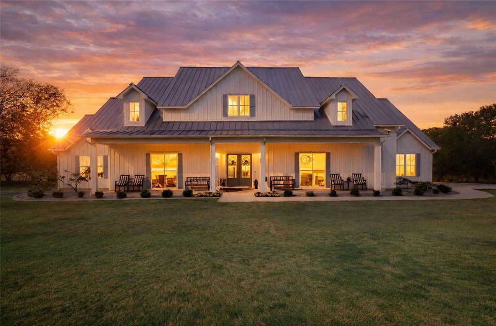 Where luxury meets tranquility, this stunning 2022 custom modern farmhouse sits on nearly 45 acres of wildflowers, mature oaks, and open pasture with prime FM 428 frontage between Denton and Frisco. Soaring vaulted ceilings, rich hardwood floors, Anderson windows, and designer lighting elevate every space. The chef's kitchen impresses with custom cabinetry, wood-wrapped range hood, gold hardware, Sub-Zero and Monogram appliances, and a generous island. The formal dining room is nothing short of spectacular at 30 by 15 feet, with lighted built-ins perfect for any occasion. The primary suite offers a freestanding soaking tub and frameless glass shower. A covered patio with stained wood ceiling and accordion sliding doors overlooks a nearly 2-acre private lake with dock. Foam encapsulation and pier-reinforced slab ensure lasting quality. Sold in conjunction with adjacent 9373 FM 428, MLS #21235523, an additional 6.65 acres and nearly 2,000 sq ft home. Come experience this exceptional signature property.