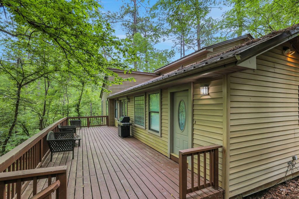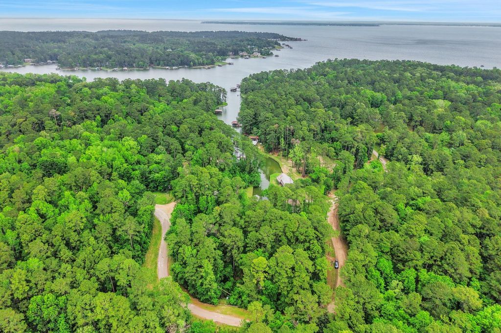 Tucked away on nearly an acre and surrounded by mature trees, this waterfront retreat feels like your own private treehouse in the woods. Offering a peaceful escape from the city, the home features 3 bedrooms and 2.5 bathrooms with a warm, inviting design throughout. The main living area showcases high ceilings with wood beams and a wall of windows that frame serene treetop views and fill the space with natural light. The kitchen is open to the living area with stainless steel appliances, wine fridge and plenty of cabinet space. Multiple decks provide ideal spaces for outdoor entertaining or simply relaxing in the quiet setting. The adjacent wooded lots create privacy and added space. Meander down to the boathouse, tucked at the quiet end of the cove where the setting feels especially peaceful and secluded. Located about an hour north of The Woodlands, this property offers a true escape with a balance of nature, privacy and lakeside living.