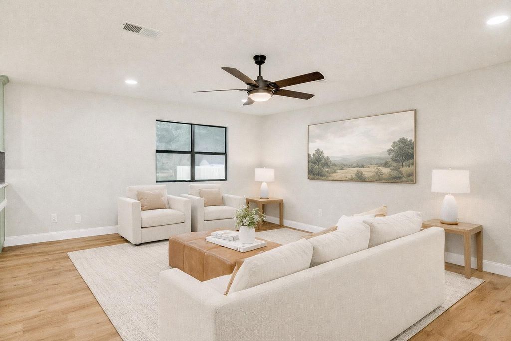 Beautiful open-concept, one story home. Wood-style laminate flooring throughout, and tile in the bathrooms. Great flow between the living, dining and kitchen space; ready for relaxing or entertaining! The kitchen boasts floor-to-ceiling custom cabinets with ample cabinet space and gorgeous granite countertops. Oversized primary suite; ensuite bath features a walk in shower with custom tile bench and a spacious walk-in closet with custom built-ins. Three additional bedrooms, one with private access to the secondary bath; secondary bath has a custom built-in vanity, granite countertops and beautifully tiled bath/shower combo. New HVAC in 2023. Freshly painted exterior in 2025. Located on a spacious lot; fully fenced back yard with new fence and 12' gate installed in 2023. Enjoy the sunny southern exposure from the expansive patio and deck space, or relax under the large shade tree; with a consistent soft coastal breeze. Just minutes from downtown Freeport and only 5 miles to the beach!