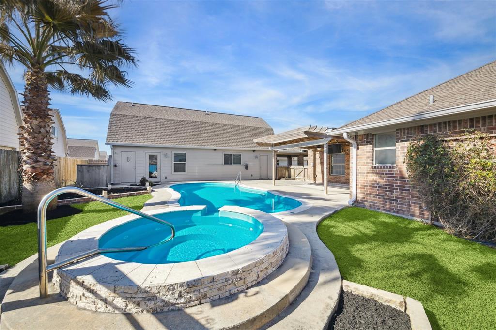 Discover this stunning home in the sought-after Lakeland neighborhood! The main house features 4 spacious bedrooms plus an office and 3 bathrooms, offering an open-concept design with engineered hardwood flooring, recessed lighting, ceiling fans, and a gas log fireplace. The island kitchen is a chef’s dream with stainless steel appliances, granite countertops, and ample cabinet space. The primary suite boasts elevated ceilings, dual sinks, a vanity, a soaking tub, and a generous walk-in closet. A separate, updated guest/pool house is perfect for multi-generational living, featuring 1 bedroom, 1.5 bathrooms, an extra upstairs sink, a cozy living, a kitchenette, a separate laundry room, wheelchair-accessible doorways, and a chair lift. Step into your private backyard oasis, complete with a sparkling saltwater pool and hot tub, a covered patio, and lush landscaping. SELLER OFFERED CONCESSIONS WITH ACCEPTABLE OFFER! HOME WARRANTY WITH POOL COVERAGE INCLUDED! Schedule your tour today!