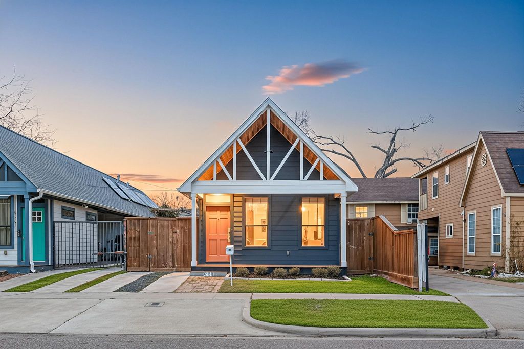 Statement-making, modern A-frame exterior gives this East End home chic curb appeal w/ a steep gable roofline, exposed truss details, clean lines, & warm wood accents that pop from the street. Inside, cathedral ceilings + incredible natural light set the tone for an open living/dining space built for entertaining. The gourmet kitchen delivers tons of countertop space, SS appliances, pantry storage, & wine fridge. Dedicated laundry room sits just off the kitchen w/ front-loading washer & dryer included. French doors lead to a pergola-covered patio & fully fenced side yard w/ raised garden bed, plus 3x6 storage shed perfect for bikes & extras. Secondary bedroom fits a queen (or twins). The 2nd bath stands out w/ built-ins, reeded-glass linen cabinet, & a cherry-finish vanity. Private primary retreat features dbl closets, an accent wall, a cozy faux fireplace vibe, & an ensuite w/ dual vanities, walk-in shower, & bonus linen closet. Prime access to Downtown, UH, TX Medical Center, & more!