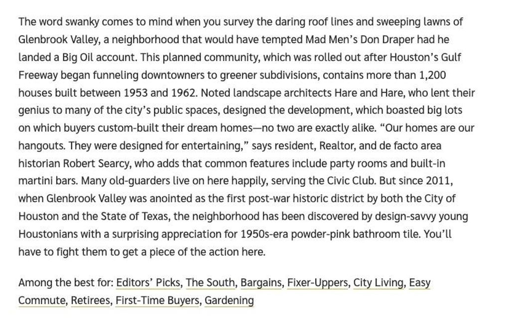 Mid-century modern ranch in the highly-acclaimed Historic District's preferred northern section. Rare opportunity to get in this section at this price point. Nestled under beautiful mature shade trees with lots of mid-century character & architectural interest ready to be brought out. The layout was ahead of it's time with an original more open concept. Bright front living and dining area with corner windows and a brick half wall that divides it (while retaining the open feel), from the den- which features interesting angled walls. Breakfast room & spacious kitchen with freshly painted cabinetry. Bedroom wing with just installed carpet over original hardwoods. All BRs are a good size with updates to the 2 full baths. Patio was enclosed & could provide additional home office space or opened back up for more light & outdoor entertaining space. Glenbrook was named a top old house neighborhood by This Old House & recognized by Houstonia magazine twice! Just 1 exit from the inner-loop.