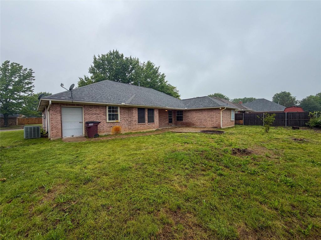 Welcome to this spacious and 3-bedroom, 2-bath home. Featuring generously sized rooms throughout, this home offers plenty of space for everyday living. Situated on a beautiful lot with mature trees in the front yard that provide shade and a serene outdoor setting. The oversized garage provides ample storage and parking, while the dedicated rear workshop with a convenient roll-up door is perfect for hobbies, projects, or additional storage. For added peace of mind, a storm shelter is included. Step outside to enjoy the inviting back stone patio, ideal for relaxing evenings or hosting gatherings. This home is move-in ready as-is or offers a great opportunity for your personal updates and customization. With a thoughtful layout, expansive living spaces, and practical features, this property blends comfort, utility, and potential in one complete package.