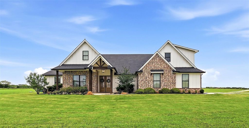 Experience refined country living in this immaculate 5-year-old custom home on 7.64 acres in sought-after Franklin ISD. Inside, vaulted ceilings and a wall of windows fill the living area with natural light and scenic views, anchored by a gas log fireplace with shiplap, mantle, and built-ins. The kitchen features a farmhouse sink, double gas ovens, 5-burner cooktop, pot filler, and oversized island. A chef’s pantry adds exceptional storage with a microwave and mini fridge. Designed for efficiency, enjoy a mudroom, half bath, and spacious laundry with sink, butcher block counters, and abundant cabinetry—connected to the primary closet with custom built-ins. The private primary suite offers a spa-like bath with soaking tub, walk-in shower, and dual vanities. Outdoor living includes a covered patio with vaulted ceiling, outdoor kitchen, grill, and TV setup. Wildlife-exempt with a well, filtration, propane, underground utilities, dual HVAC, oversized garage, tankless heater, and generator.