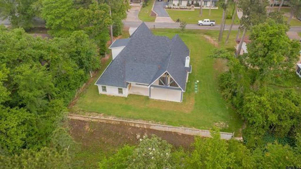 Welcome to your brand-new home in the gated Hideaway Lake community—where everyday living feels a little more relaxed and a lot more beautiful. This thoughtfully designed 4-bedroom, 3-bath home was built with both style and function in mind, offering clean finishes, open spaces, and plenty of natural light throughout that makes every room feel warm and inviting. As you walk in, you’re greeted by an open layout, a gorgeous brick floor to ceiling wood-burning fireplace, wood beamed vaulted ceilings, with large sliding glass doors that lead out to a quiet backyard—ready for whatever you have in mind, whether that’s a patio setup, fire pit, or garden space. The patio cover has a stunning bead-board finish. This setting overlooks a tranquil creek located at the back of the property. The kitchen really stands out with white cabinetry, quartz countertops, a striking backsplash, gold hardware, an oversized farmhouse sink, and a walk-in pantry with tons of storage. The primary suite feels like its own private escape, with double doors leading to the patio and a spacious bathroom featuring a soaking tub, walk-in shower, and a closet that connects directly to the laundry room (a detail you’ll appreciate daily). Downstairs, there’s also a beautiful office with a striking blue accent wall and detailed trim—could also serve as a fourth bedroom, game room or library. Upstairs, you’ll find two additional bedrooms and a full bath—perfect for guests, kids, or even a home office setup. Hideaway offers a resort-style living with a Clubhouse, 24-7 security, 3 private lakes, 27-holes of golf, community pool and beach, tennis and pickleball courts, and multiple parks. Hideaway is in Lindale ISD, considered one of the best school districts in Texas.