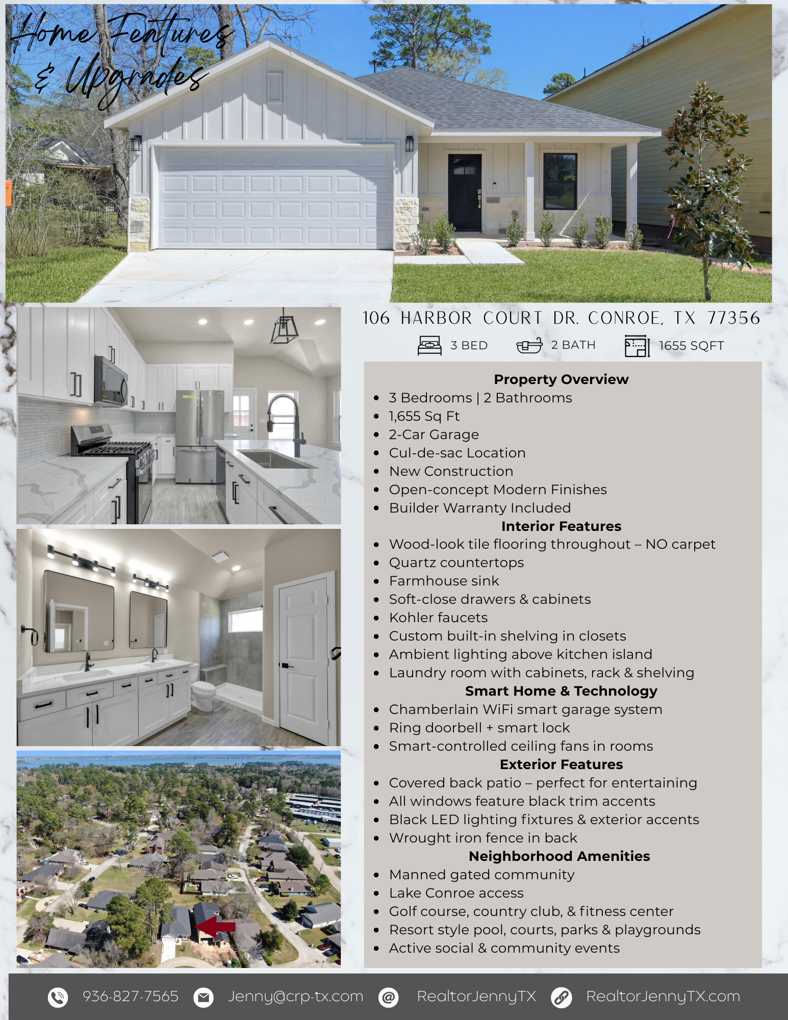 Stunning custom new construction in the highly sought-after April Sound gated community! Located in a beautiful, family-friendly neighborhood, this home offers modern design with warm, inviting finishes throughout. Wood-like tile flooring flows throughout entire home and complementing the open-concept layout. The island kitchen is the heart of the home, featuring quartz countertops, a farmhouse sink, soft close drawers and cabinets, and stylish ambiance lighting. The spacious primary suite offers a luxurious retreat with a walk-in shower and a huge master closet complete with built-ins. Spacious 2-car garage with Chamberlain Wi-Fi smart garage door opener, offering convenient remote access, added security, and modern functionality for everyday living. Enjoy indoor-outdoor living with a covered patio overlooking a fully fenced backyard—perfect for relaxing or entertaining. Quality craftsmanship and thoughtful design shine throughout. Builder providing new construction home warranty!