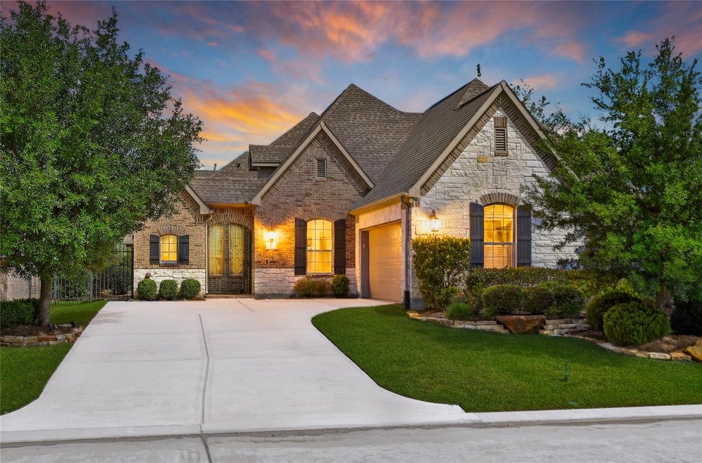 Located in The Woodlands-Creekside, this former model home in Timarron Lakes, was thoughtfully designed and barely lived in. Positioned on an oversized corner lot across the Lake, this residence offers privacy, and scenic beauty. Lush landscaping surrounds the property. A generously sized driveway leads to the 2.5-car side-entry garage and a gated front courtyard, where a tranquil sitting area overlooks the peaceful lake views. An outdoor fireplace enhances the ambiance, with additional storage conveniently positioned behind it. Inside, High Ceilings grace the entryway and hallways, and a Vaulted ceiling elevates the family room. Premium features include, wood flooring, granite and marble countertops, wine room, a second fireplace that anchors the family room, and an expansive covered patio. Modern conveniences include pre-wiring for alarm and low-volt, along with built-in speakers in the family room, back porch, and primary suite—signature features befitting a former model home.