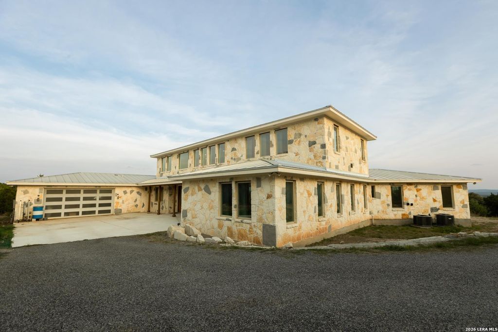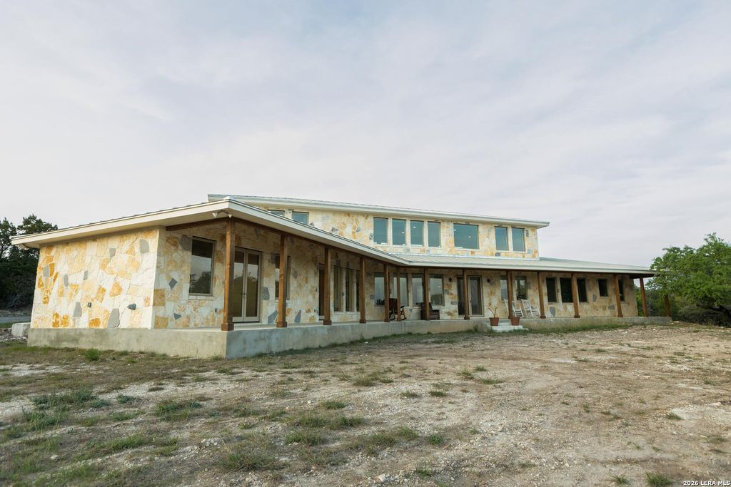 Stunning custom home built in 2023 situated on 14.75 acres in Bandera, offering a perfect blend of modern luxury and Hill Country living. This spacious 4-bedroom, 4-bath home features approximately 3,500 square feet with an open-concept design and soaring 19-foot ceilings in the living area. Large windows throughout provide abundant natural light and showcase breathtaking views and the perfect setting for peaceful wildlife watching right from your own backyard. The chef's kitchen is equipped with high-end appliances including a Sub-Zero refrigerator/freezer, Wolf 6-burner dual-fuel range with double oven, Wolf microwave drawer, Cove dishwasher, and Scotsman ice machine. Additional features include quartzite countertops, a large island, walk-in pantry, and built-in desk area. Copper accents and quality finishes add warmth and character throughout. The home offers generous storage, ceiling fans in all bedrooms and living areas, and a spacious porch ideal for enjoying the surrounding lan