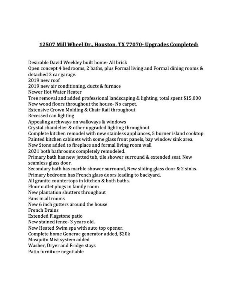12507 Mill Wheel Dr is listed for sale at $ 399,900. The Single-Family property has 4 bedrooms, 2 Full Bathrooms, 2462 square feet and was built in 1990. The lot size is 7475 Square feet. ##BR##Welcome to your new home! A fantastic find located in the Willowbrook area - near the mall, and a short commute to FM 1960/Beltway 8/Hwy 249 and Hwy 6! Charming 4 bedroom, 2 bath home with a fantastic floor plan offering spacious rooms, bright and open areas - plus attention to detail with attractive architectural touches like niches, wood shutters on arched windows, built-ins, wall moldings and more! Foyer opens to formal living room with stone accent wall and new wood flooring. Formal dining room with tile flooring and chadelier lighting. Family room has a stone fireplace and opens to chef’s kitchen with granite countertops, glass front cabinets, bay window, gas cooktop, stainless steel appliances and a breakfast area with access to detached garage and back patio. Texas sized bedrooms and gorgeous bathrooms! Lovely backyard space with spacious flagstone patio, Swim Spa with stairs, a Generac generator, mosquito misting system and more. Roof and AC-2019, professional landscaping added- A must see home!