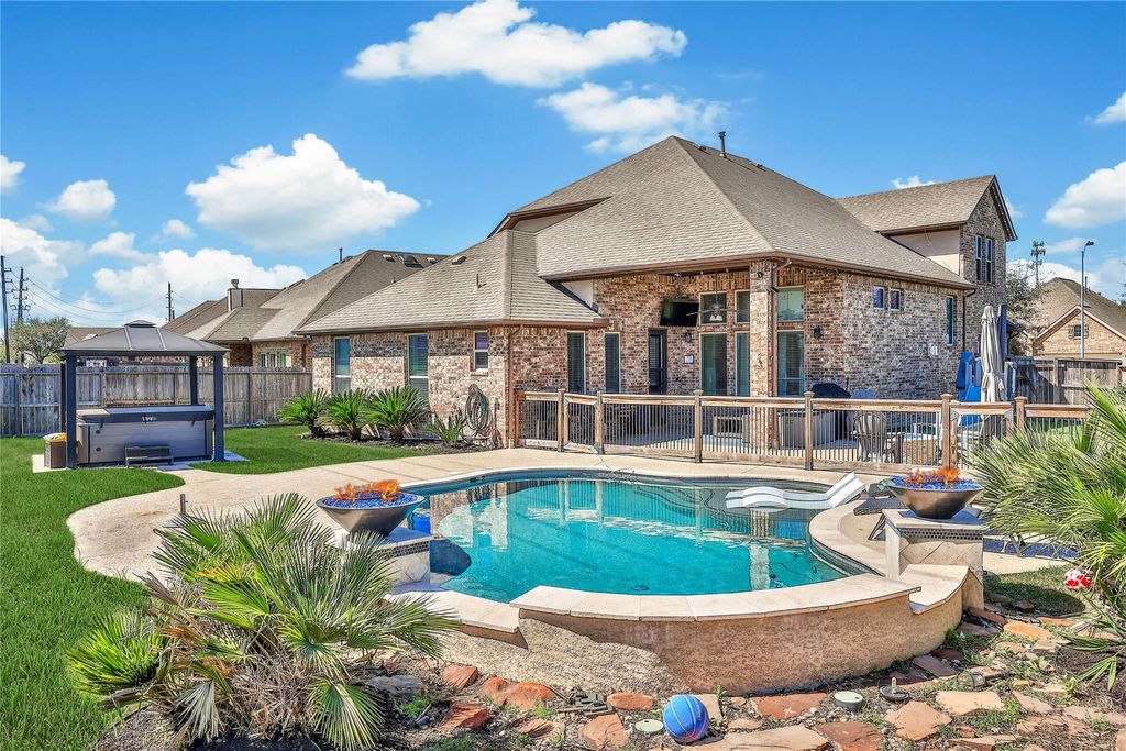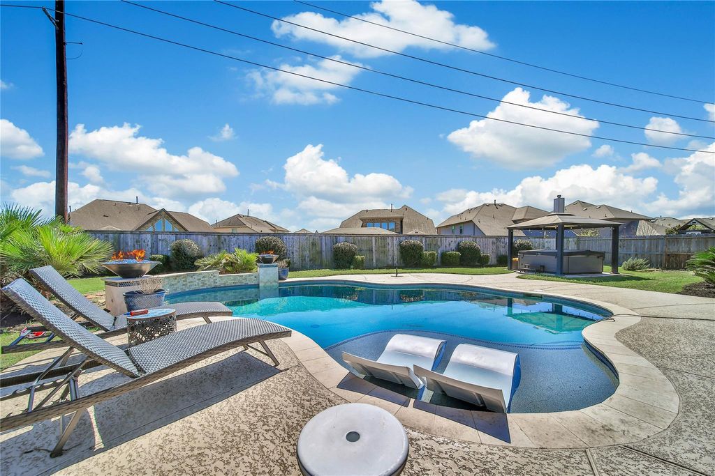 Welcome to this stunning Harvest Green home featuring 4 bedrooms, 3 and a half baths and a backyard perfect for our long summers. This home offers a thoughtful open layout filled with natural light. The kitchen features a large island that flows seamlessly into the main living area. The private primary suite is a true retreat with ensuite bath and a walk-in closet equipped with custom shelving. Upstairs, enjoy a spacious game room and a dedicated media room ideal for movie nights, game days, or hosting guests. One of the three secondary bedrooms has an ensuite bathroom and can easily be a second primary bedroom. Step outside to your own backyard escape complete with a heated pool, water features, gas fire bowls, firepit, and patio. Come see this home today!