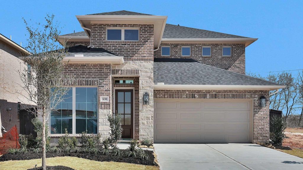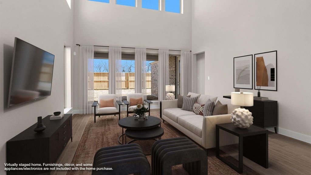 Two-story entry framed by home office with French doors. Two-story family room with 19-foot ceiling flows into the kitchen and dining area. Island kitchen with built-in seating space, a 5-burner gas cooktop and corner walk-in pantry. Secluded primary suite features a grand wall of windows. Primary bath offers a French door entry, dual vanities, garden tub, separate glass enclosed shower and two walk-in closets. Additional bedroom just off the kitchen area. Second level hosts bedrooms, and a large game room. Utility room. Covered backyard patio. Mud room just off the two-car garage.