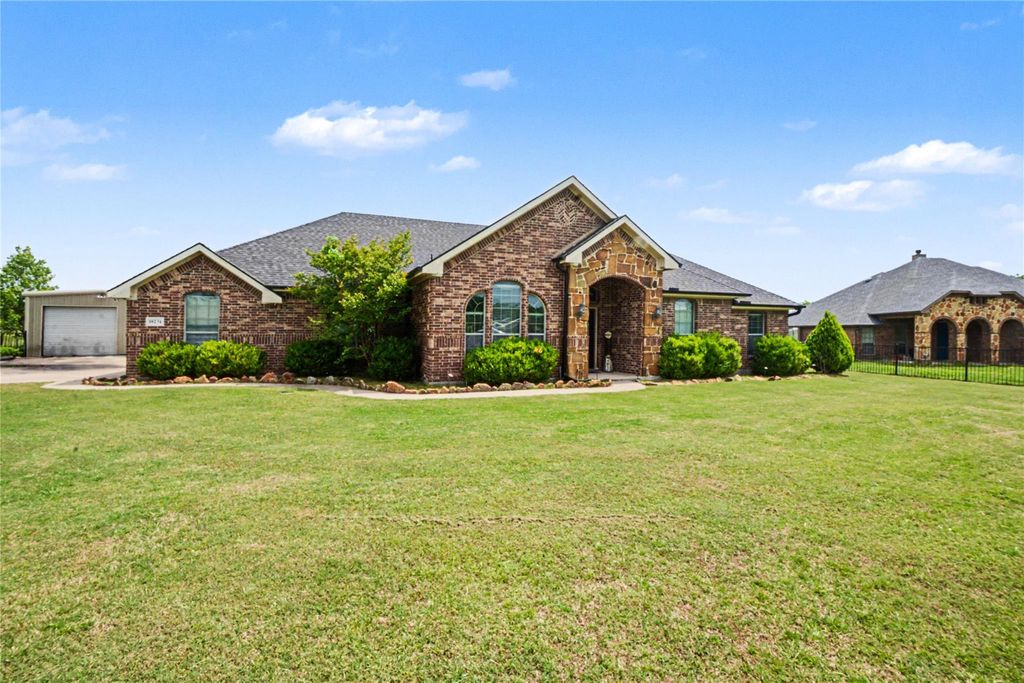 Tucked away on a quiet cul-de-sac just off Helms Trail, this 1+ acre property offers space, flexibility, and privacy with no HOA restrictions. The home features an open layout connecting the kitchen and breakfast area with a functional breakfast bar, along with two living areas that provide options for entertaining, a second lounge, or workspace. The split-bedroom design offers added privacy for the primary suite. Outside, a large detached shop adds valuable storage or workspace potential. Located within walking distance to the neighborhood pond and set on a low-traffic street, this property offers a quieter setting with room to spread out. A rare opportunity for acreage and versatility.