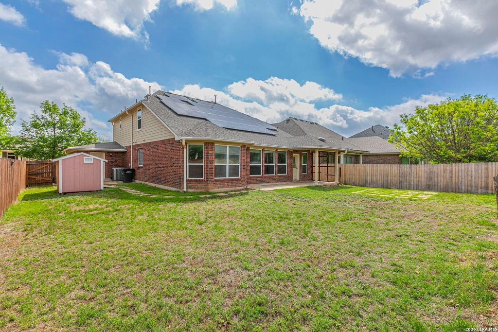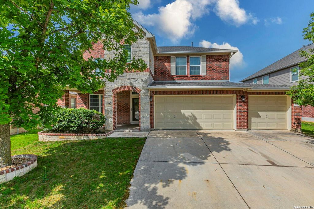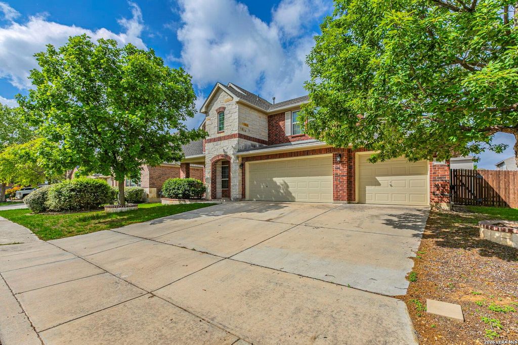 Get that WOW factor in this breathtaking all sides brick David Weekley home that offers easy commute to Lackland AFB & NSA as well as great shopping and restaurants on 151. This open concept home showcases your elegant crown molding, sleek granite counters, GAS, brushed stainless steel appliances, dramatic rod iron stair, tile flooring throughout the first floor! MB features dual vanities, garden tub, & shower. Solar panels installed to aid the electricity charges, an outdoor shed for lawn and garden equipment in addition to lifetime guaranteed gutters that do not required annual servicing. You'll feel like you're on vacation with a resort like pool, park with playground and walking trails!
