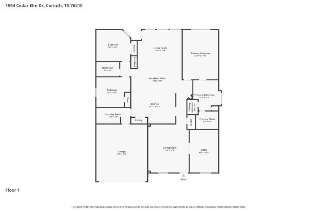 1594 Cedar Elm Dr is listed for sale at $ 410,000. The Residential - Single Family property has 3 bedrooms, 2 Full Bathrooms, 1984 square feet and was built in 1999. The lot size is 0.332 Acres. ##BR##Welcome to 1594 Cedar Elm Dr in Corinth—a beautifully maintained brick home with standout curb appeal, soaring ceilings, and an oversized corner lot that is hard to find. Inside, you’ll find rich wood-look laminate flooring, abundant natural light, a spacious formal dining room, a dedicated front office with French doors, and an open-concept living area with a cozy fireplace that flows seamlessly into the kitchen. The kitchen offers granite countertops, stainless appliances, abundant cabinetry, bar seating, and a center island—designed for both everyday living and easy entertaining.