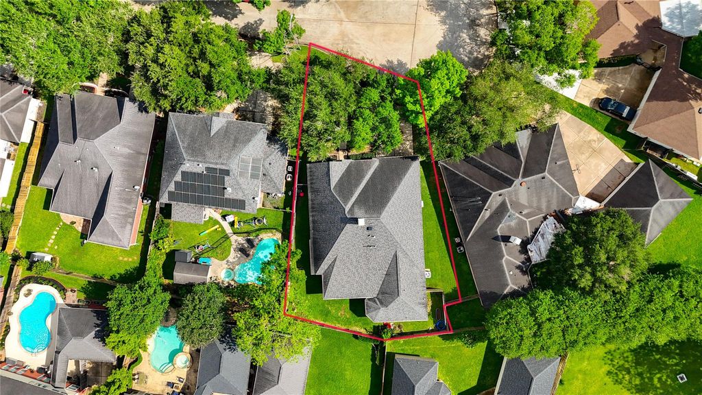 Spacious 4-bedroom, 3 full bath home with 3-car garage situated on a cul-de-sac lot. Recently repainted interior/exterior..move-in ready. Features include leaded glass front door, custom shutters, new double-pane windows, w/open-concept floorplan. Tile flooring in foyer, kitchen & wet areas w/ the rest of the home featuring engineered bamboo floors. Large kitchen open to the family room, offering a functional layout for everyday living and entertaining. Features include a large island, ample storage, stainless steel appliances & recessed lighting. Ceiling fans throughout. Primary bathroom remodeled w/dual vanities &large walk-in shower. Covered backyard patio provides additional outdoor space. Garage includes split-unit A/C, added outlets, workbench, and new garage doors. Neighborhood amenities include a walking path around the lake, pools, pickleball and tennis courts, and playgrounds. Convenient location with access to Westpark Tollway, Sugar Land, shopping, and dining.