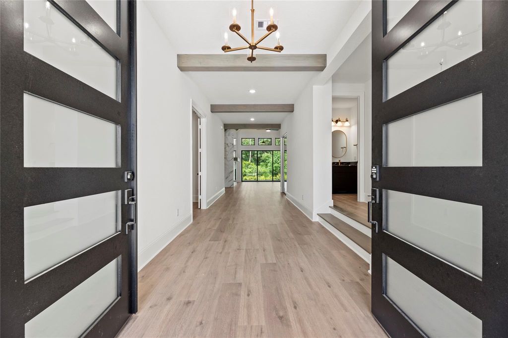 Experience luxury living in this stunning one-story Eastland II Plan by Drees Custom Homes located in the peaceful Magnolia area within Audubon’s master planned community. This 4-bedroom, 4.5-bath residence features a luxurious primary retreat, private guest ensuites, and flexible spaces including a game/media room, flex room, and dedicated study. Elegant designer finishes like gold light fixtures, double mahogany doors, and wood ceiling details create a timeless appeal. The open family room showcases a tiled floor-to-ceiling fireplace and large sliding glass doors that extend to a covered patio, perfect for indoor-outdoor entertaining. Enjoy the breathtaking tranquil views of the mature trees surrounding the home. A glass-enclosed wine room, oversized kitchen island, and sleek modern touches add sophistication. Designed for comfort, the home includes energy-efficient open-cell spray foam insulation, a whole-home dehumidifier, and a newly installed water softener system.