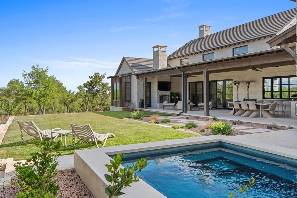 Tucked into the rolling Hill Country landscape of Boot Ranch, 29 Brenham Trail (Lot 793) offers a rare blend of privacy, flexibility, and refined indoor-outdoor living. Thoughtfully designed, the main residence features a spacious one-bedroom layout with a dedicated office that can easily be converted into a second bedroom, making it ideal for both full-time living and weekend escapes. Inside, the open-concept living area is anchored by striking wood beam ceilings, creating warmth and architectural character while seamlessly connecting the kitchen, dining, and living spaces. Expansive glass windows open completely, blurring the line between indoors and out and extending the main kitchen into a fully equipped outdoor kitchen