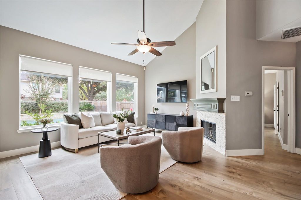 Beautiful home with a private backyard oasis! This spacious 4-bedroom features soaring ceilings, wide-plank flooring, and plantation shutters. The light-filled family room overlooks the sparkling pool with tanning ledge and relaxing spa. The open kitchen offers white cabinetry, granite countertops, stainless appliances, and a center island. The first-floor primary suite includes pool views, a soaking tub, and walk-in shower. Enjoy outdoor living under the large, covered patio with TV and seating areas, perfect for entertaining! Solar panels provide energy efficiency. Ideally located on a quiet cul-de-sac in a desirable neighborhood close to shops, dining, and top-rated schools.