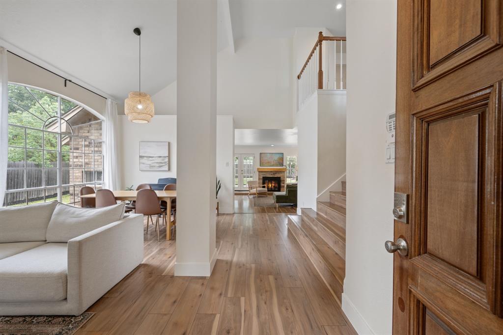 From the moment you step inside, soaring ceilings, warm wood floors, and a stunning arched window set a bright and welcoming tone. The open layout connects the living, dining, and kitchen spaces seamlessly. The fully updated kitchen features sage green shaker cabinetry, white quartz countertops, a center island with bar seating, wall microwave and oven, gas cooktop, and stainless steel appliances.