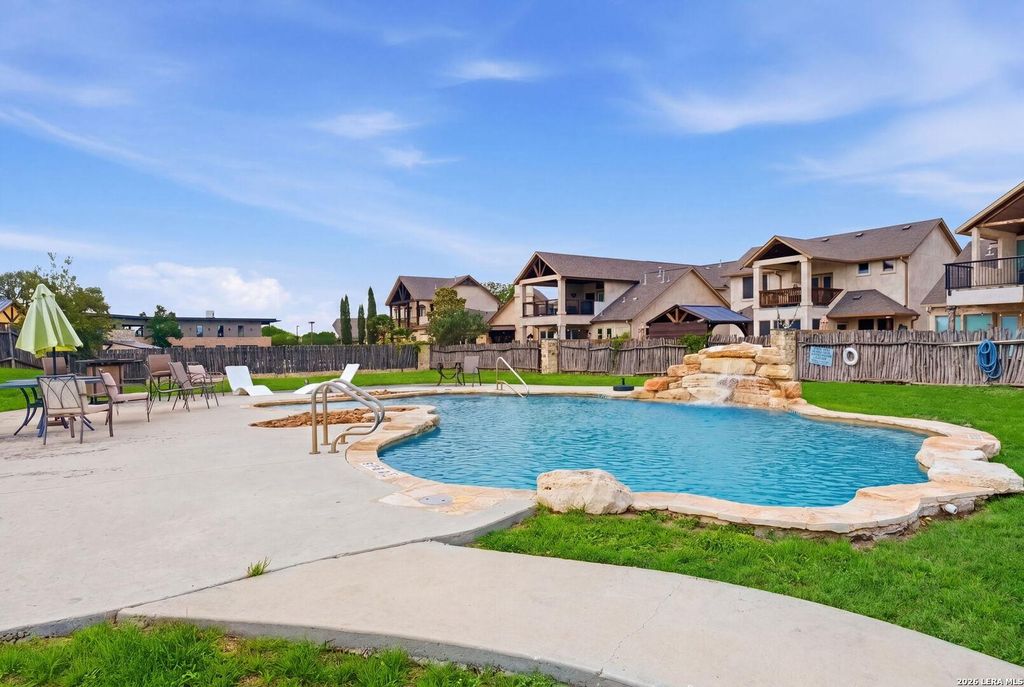 Imagine living within a charming blend of Texas history and vibrant small town lifestyle in New Braunfels. Residents in this gated community enjoy walking or riding their golf carts to the Gruene Historic District, full of riverside dining options, boutique shopping, and multiple live music venues. The famous Gruene Hall attracts top-tier talent and visitors from all over the world. Behind the restricted access gate is this beautiful 3 Bedroom, 2.5 bath rock and stucco home with a great outdoor kitchen with sink and grill for enjoyment and entertainment. Another staycation feature is the community rock waterfall custom pool and grape vineyard producing grapes for your jam, etc. The community has a private entrance to the vineyard. The inviting covered front porch welcomes you to this piece of heaven with a 2 story family area open to the kitchen. Granite countertops, custom cabinetry, large walk in pantry, full utility room, huge under stairs storage closet, and half bath for gu