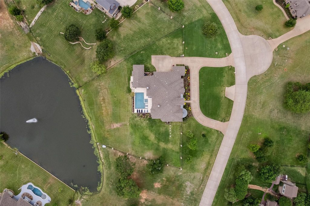 Welcome to this exceptional 5-bedroom, 5-bath estate set on 1.63 scenic acres, where luxury, comfort, and thoughtful design come together beautifully. With a 5-car garage, electric gate, and a backyard overlooking a peaceful pond, this property offers a truly rare lifestyle opportunity. Inside, every bedroom features its own private ensuite bathroom, creating the ultimate sense of privacy and convenience. Closets are spacious walk-ins, and each bedroom is generously sized to accommodate a king-size bed. Plantation shutters throughout add timeless elegance, while the living room is highlighted by stunning exposed wood ceiling beams that create warmth and character. The well-appointed kitchen is designed for both everyday living and entertaining, featuring two pantries—one of which is exceptionally large—providing abundant storage. Functionality meets luxury with two laundry rooms, including one conveniently located within the primary closet for everyday ease. A private mother-in-law suite within the home offers incredible flexibility, complete with a refrigerator, microwave, sink, wine rack, and ample cabinet storage—perfect for multi-generational living, long-term guests, or a game room. The backyard is a true showstopper, featuring travertine decking, a custom chlorine pool, and a pool chiller system that can cool the water approximately 15 degrees below ambient temperature—ideal for Texas summers. The outdoor living area is complete with a kitchen, fireplace, and multiple seating areas, perfect for relaxing or entertaining. This home offers a seamless blend of luxury, functionality, and exceptional outdoor living in a peaceful, scenic setting.