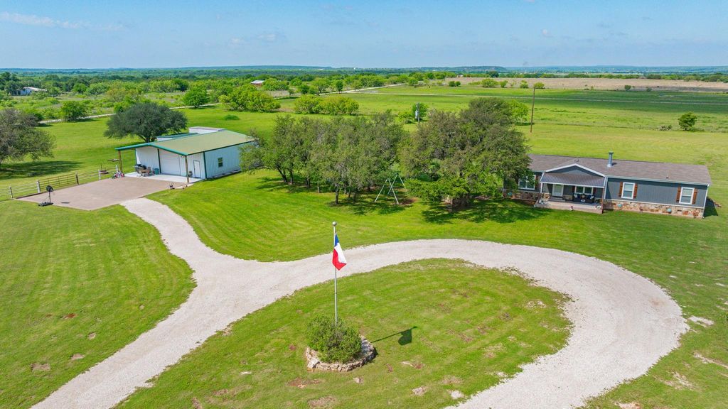 Welcome to your ideal slice of Texas country living! This beautifully maintained 3-bedroom, 2-bath custom manufactured home sits on 7.128 acres, offering the perfect blend of comfort, space, and functionality. Inside, you’ll find a bright open-concept layout filled with natural light, highlighting a spacious living area complete with a cozy wood-burning fireplace and an additional living room for extra space. The kitchen features a large island perfect for gathering, along with ample storage and workspace. The split-bedroom design provides privacy, with a generous primary suite that includes a double vanity, a relaxing garden tub, and a separate oversized shower. An extra-large laundry or mud room with a utility sink adds everyday convenience and practicality. Step outside and enjoy peaceful views from the covered front porch or unwind on the covered back patio, where wide-open scenery creates that sought-after farmhouse feel, all within a quiet country neighborhood just off the main road and less than 10 minutes from Graham. The property truly shines with its impressive 1,600 sq ft insulated shop. Complete with a full bathroom, bay door, and extended overhang, this versatile space can serve as a workshop, entertaining area, or even additional living quarters. The current owners have added a removable two-room setup inside, allowing for flexible use depending on your needs. Surrounding concrete provides ample room for parking, recreation, or even a basketball court. Additional features include mature trees, cross fencing, and a rock and pipe-fenced entrance that leads to a circular driveway with a flagpole centerpiece, creating a welcoming and picturesque first impression. This property offers endless possibilities with room to grow, work, and enjoy true country living without sacrificing convenience.
