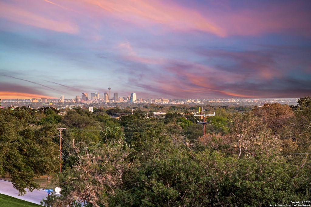 Amazing Views of the City! Experience penthouse-level skyline views in your own private retreat. Welcome to this exceptional home in the prestigious Oak Hills neighborhood, near the San Antonio Medical Center and only a stone's throw from the Oak Hills Country Club. This stunning single-story home blends classic curb appeal with chic modern interiors. Mature oak trees frame the stately front elevation, offering both shade and a serene, park-like ambiance as you arrive. Step inside to discover airy, open li