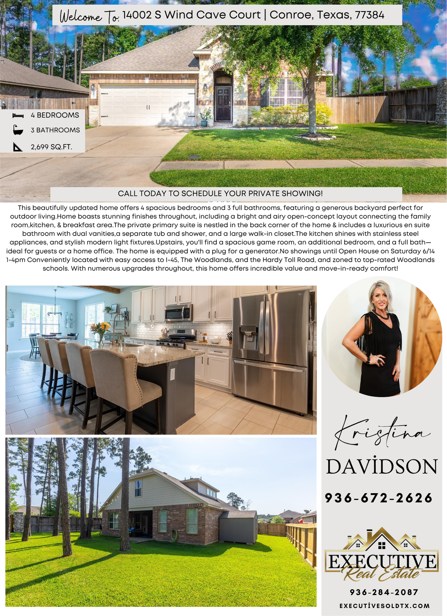 This beautifully updated home offers 4 spacious bedrooms and 3 full bathrooms, featuring a generous backyard perfect for outdoor living.Home boasts stunning finishes throughout, including a bright and airy open-concept layout connecting the family room,kitchen, & breakfast area.The private primary suite is nestled in the back corner of the home & includes a luxurious en suite bathroom with dual vanities,a separate tub and shower, and a large walk-in closet.The kitchen shines with stainless steel appliances, and stylish modern light fixtures.Upstairs, you'll find a spacious game room, an additional bedroom, and a full bath—ideal for guests or a home office. The home is equipped with a plug for a generator.No showings until Open House on Saturday 6/14 1-4pm Conveniently located with easy access to I-45, The Woodlands, and the Hardy Toll Road, and zoned to top-rated Woodlands schools. With numerous upgrades throughout, this home offers incredible value and move-in-ready comfort!