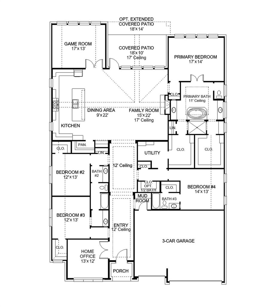 Home office with French doors frame entry. Open family room with a wall of windows and a wood mantel fireplace extends to kitchen and dining area. Island kitchen with built-in seating space features a walk-in pantry and a 5-burner gas cooktop. Secluded primary suite with a wall of windows. Primary bathroom features a French door entry, dual vanities, freestanding tub, separate glass enclosed shower, a linen closet and two walk-in closets. Large game room with French door entry and a wall of windows just off the family room. Private guest suite with a full bathroom and a walk-in closet. A Hollywood bathroom, additional bedrooms and utility room completes this spacious design. Extended covered backyard patio. Mud room just off the three-car garage.