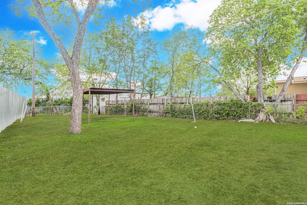 Don't miss this cute home nestled in San Antonio's established University Park neighborhood! Featuring 2 bedrooms and 1 bath across 984 sq ft of comfortable living space, this home offers dark laminate wood flooring throughout the main living areas and fresh carpet in both bedrooms. The kitchen showcases classic white cabinetry, tiled countertops and backsplash, and a convenient pass-through window opening to the family area. The full bath features a combination tub/shower with tiled surround, ceramic tile half-wall, and single vanity. Additional highlights include ceiling fans throughout, ornamental iron window guard bars, a roof that's approximately 2 years old, and a spacious backyard-perfect for relaxing, entertaining, or future customization. Location Highlights: Conveniently located near Loop 410, IH-10, and I-35 with easy access to downtown San Antonio, the River Walk, St. Mary's University, and Our Lady of the Lake University. Woodlawn Lake Park, SeaWorld, and the Medical Cente