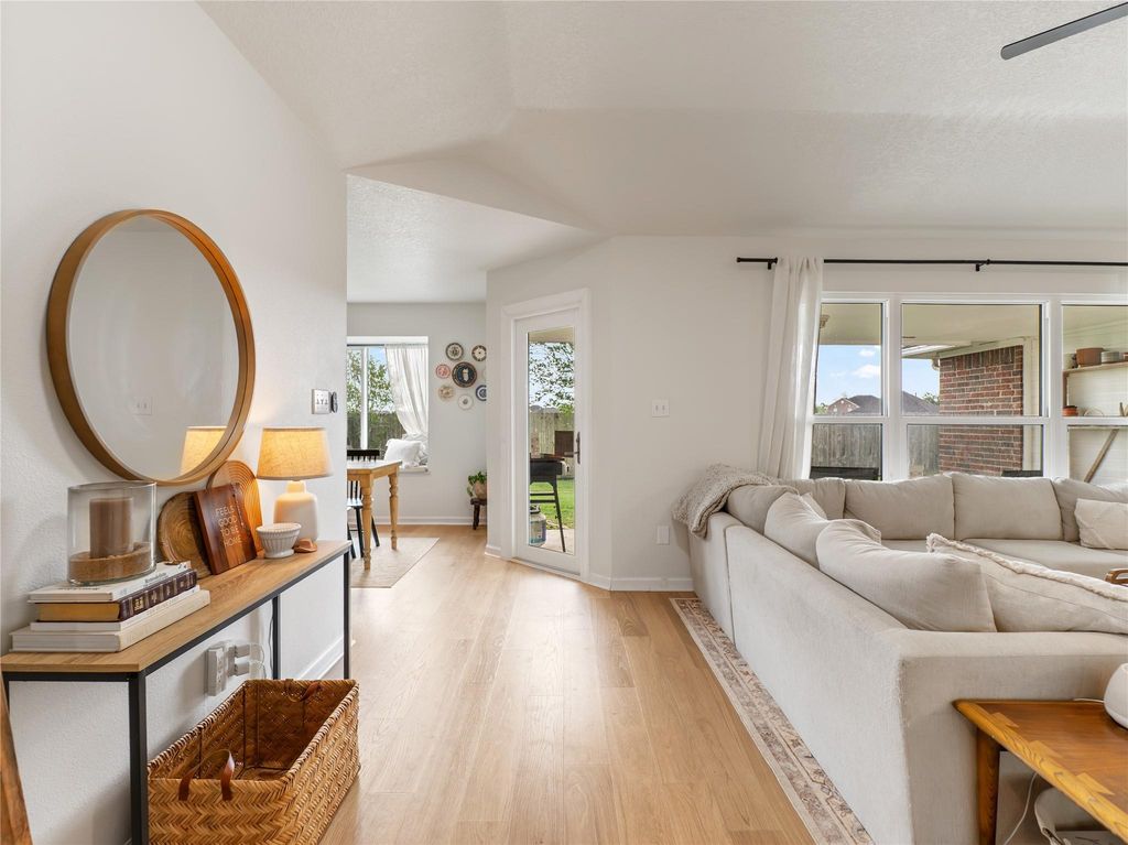 Beautifully updated one story home in the desirable Del Norte community. Recent improvements include: new windows, fully renovated kitchen, new flooring & baseboards throughout, fresh interior paint, updated utility room, updated fixtures throughout, and more. The home features a great layout with open-concept living, high ceilings, 3 bedrooms, and 2 full baths. The renovated kitchen boasts shaker-style cabinetry, new stainless steel appliances, an apron-front sink, and tasteful finishes. The spacious primary suite includes a sitting area - ideal for a home office or nursery - along with an en-suite bath with a remodeled shower, dual-sink vanity, and two walk-in closets. Large utility room with built-in cabinetry, shelving, and designer tile. The washer and dryer WILL STAY and is included in the sale. Major bonus for buyers. Outdoors, enjoy the private, fenced backyard with a covered patio and storage shed. Situated on a quiet street with oak trees and minutes from Hwy 60 & Hwy 35.