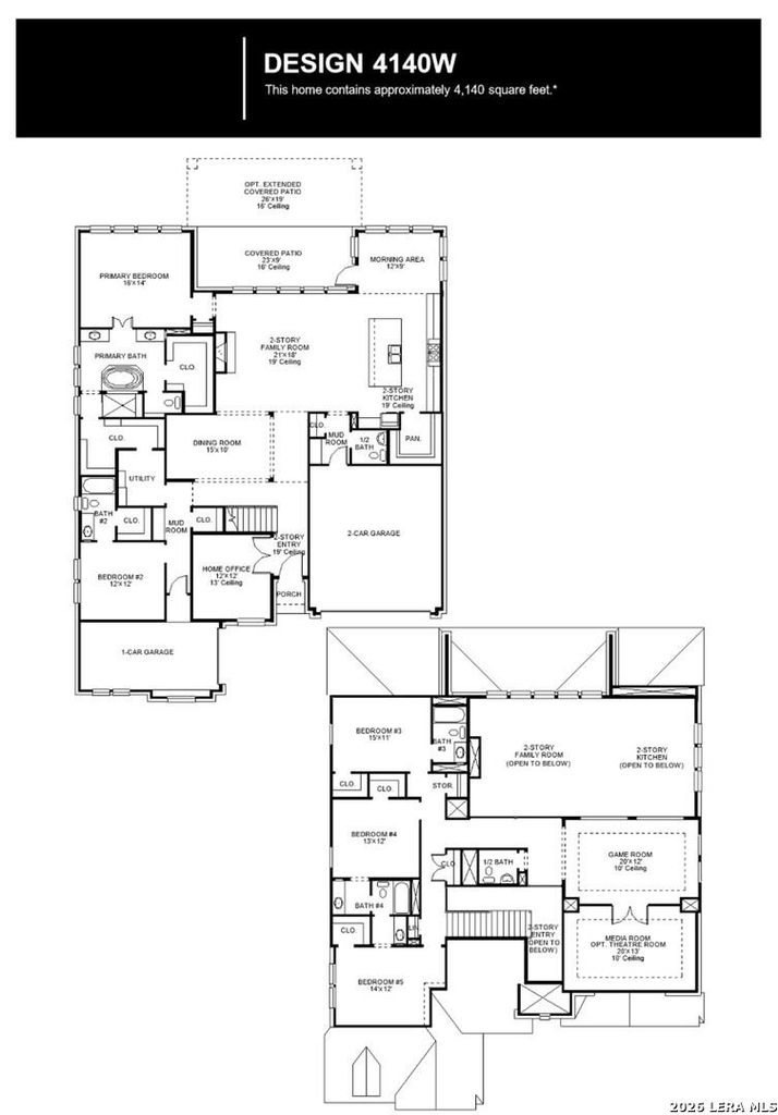 Two-story entry framed by home office with a French door entry. Formal dining room just off the family room and kitchen. Generous two-story family room with 19-foot ceilings, a fireplace and sliding glass doors. Island kitchen features built-in seating space, a two-story ceiling and a large walk-in pantry. Morning area just off the kitchen with three large windows. Secluded primary suite offers a large bedroom with a wall of windows, French doors that open to the primary bathroom, dual vanities, freestanding tub, separate glass enclosed shower and two walk-in closets with private access to the utility room. Guest suite with full bathroom and a walk-in closet on first floor. Second floor hosts a large game room, theatre room with a French door entry, additional bedrooms with walk-in closets, a guest suite with full bathroom, a Hollywood bathroom and half bathroom. Extended covered backyard patio. Mud room just off the two-car garage.