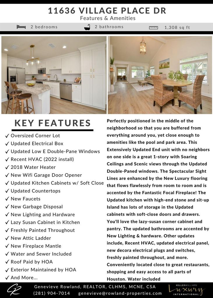 Perfectly positioned in the middle of the neighborhood so that you are buffered from everything around you, yet close enough to amenities like the pool and park area. This Extensively Updated End unit with no neighbors on one side is a great 1-story with Soaring Ceilings and Scenic views through the Updated Double-Paned windows. The Spectacular Sight Lines are enhanced by the New Luxury flooring that flows flawlessly from room to room and is accented by the Fantastic Focal Fireplace! The Updated kitchen with high-end stone and sit-up Island has lots of storage in the Updated cabinets with soft-close doors and drawers. You'll love the lazy-susan corner cabinet and pantry. The updated bathrooms are accented by New Lighting & hardware. Other updates include, Recent HVAC, updated electrical panel, new decora electrical plugs and switches, freshly painted throughout, and more. Conveniently located close to great restaurants, shopping and easy access to all parts of Houston. Water included