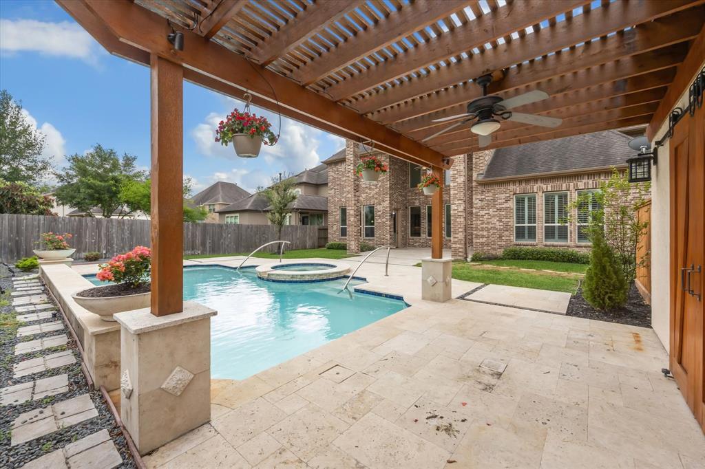 This fabulous home is located in the gated section of Sycamore Meadows, freshly painted and new second flooring throughout, including all bedrooms. It features 4 beds, 3 full & 1 half bath, with a Sunshine built pool & spa. 2 bedrooms down. High ceilings, wood floors & elegantly curved wood staircase. Kitchen has high level granite, white accent center island, mosaic backsplash, double ovens, built-in desk, along with large butler's pantry. The primary suite has plantation shutters, tray ceilings including private door to back patio & pool. Formal dining, study w/cathedral style ceilings. Spacious game room w/built-ins, & media room. Backyard is a masterpiece w/pool, spa, waterfall features, fire bowl, pool house, surrounded with travertine tile. Ample landscaping is enhanced by up lighting & a pergola offers extra shaded entertaining space. Whole home Generac generator fully installed. Zoned to award winning Katy ISD. Easy access to West Park Tollway, Grand Parkway and I-10.