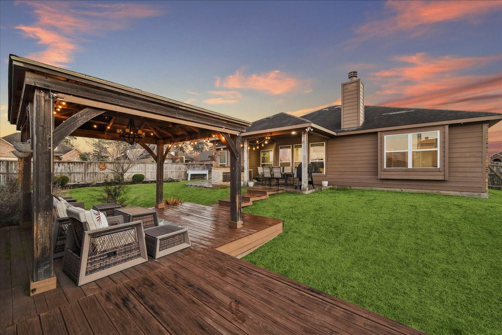 Charming brick and stone home situated on a coveted corner cul-de-sac lot in Magnolia’s Ranch Crest. This 3-bedroom, 2-bath home features a 2-car attached garage and welcoming front porch that opens into a foyer flowing seamlessly into a private home office and formal dining room. The spacious, light-filled living room showcases a corner fireplace and opens to an island kitchen with breakfast bar, granite countertops, pantry, built-in desk nook, and adjoining breakfast room—ideal for everyday living and entertaining. The primary suite offers a peaceful retreat with an en-suite bath featuring double vanities, soaking tub, separate frameless walk-in shower, and walk-in closet. Two secondary bedrooms share a full bath. Step outside to an inviting outdoor oasis with a covered patio and outdoor kitchen perfect for entertaining, plus a separate pergola patio and storage shed for added convenience. This home delivers the perfect blend of comfort, style, and location.