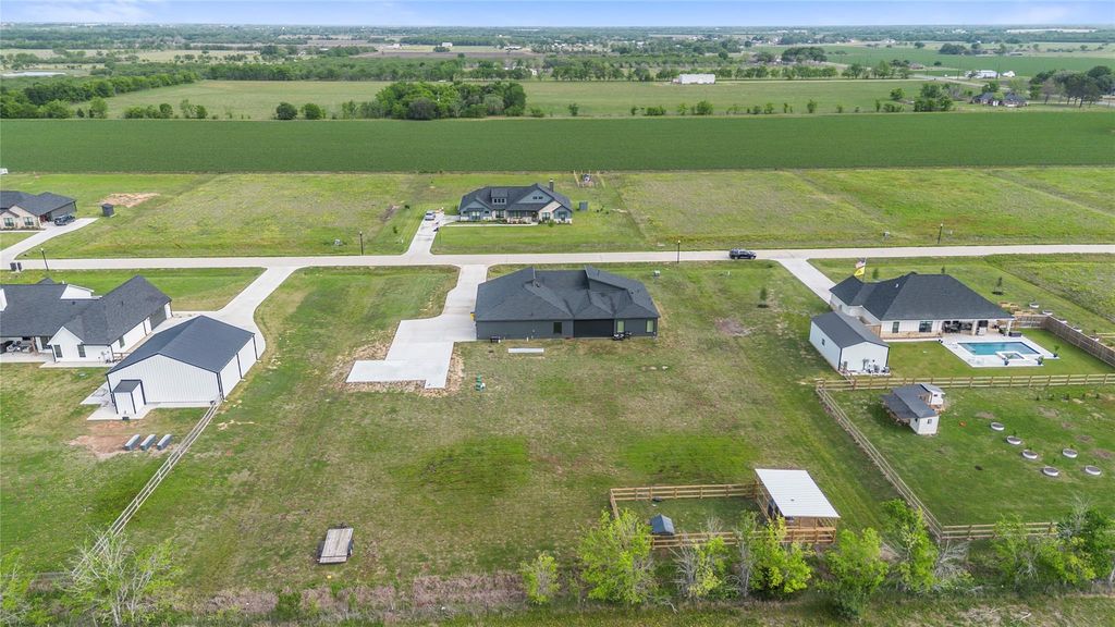 Striking, bold, and truly one of a kind, this modern estate in Sealy, TX redefines luxury living. Set on 1.2 acres, this 3,200 sqft custom home showcases rare architecture with dramatic lines, soaring 10 ft ceilings, and expansive open living spaces filled with natural light. The showpiece kitchen stuns with premium Bosch appliances, a massive waterfall island, leather granite surfaces, and custom cabinetry to the ceiling. Designed for unforgettable entertaining, walls of glass open to a resort-style covered patio with outdoor kitchen connections and built-in audio. The primary suite offers a spa-like retreat with sleek finishes and a frameless walk-in shower. Complete with a 3-car garage, extended driveway, and a dedicated concrete pad ready for a future detached 3-car garage or shop. A statement home unlike anything else on the market.