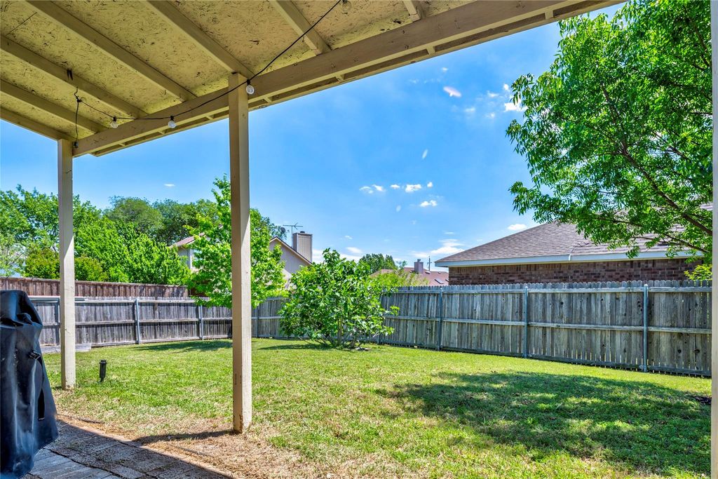 Charming one-story home in desirable Harvest Run subdivision just off of Hebron Parkway with easy access to Dallas North Tollway and SH 121! Step inside to a light-filled living room where a soaring 12-foot ceiling, wood laminate flooring, and a focal gas fireplace create a warm and inviting ambiance. The adjoining kitchen features granite counters, travertine backsplash, breakfast bar, stainless steel appliances, & white painted cabinets. The primary suite offers a beautifully updated bathroom with a granite countertop, dual sinks, and a frameless shower showcasing designer tile work. The secondary bathroom has also been thoughtfully updated with a granite countertop and painted cabinetry, ensuring a cohesive feel throughout the home. Outdoors, a lovely grassy backyard provides plenty of space for kids and pets to run and play, while the covered patio creates room for a grill and comfortable seating. Conveniently located just minutes from Arbor Hills Nature Preserve and Grandscape, this home offers the perfect blend of comfort, style, and accessibility in a highly sought-after location. 2026 AC fan, fan motor, & fan grill.
