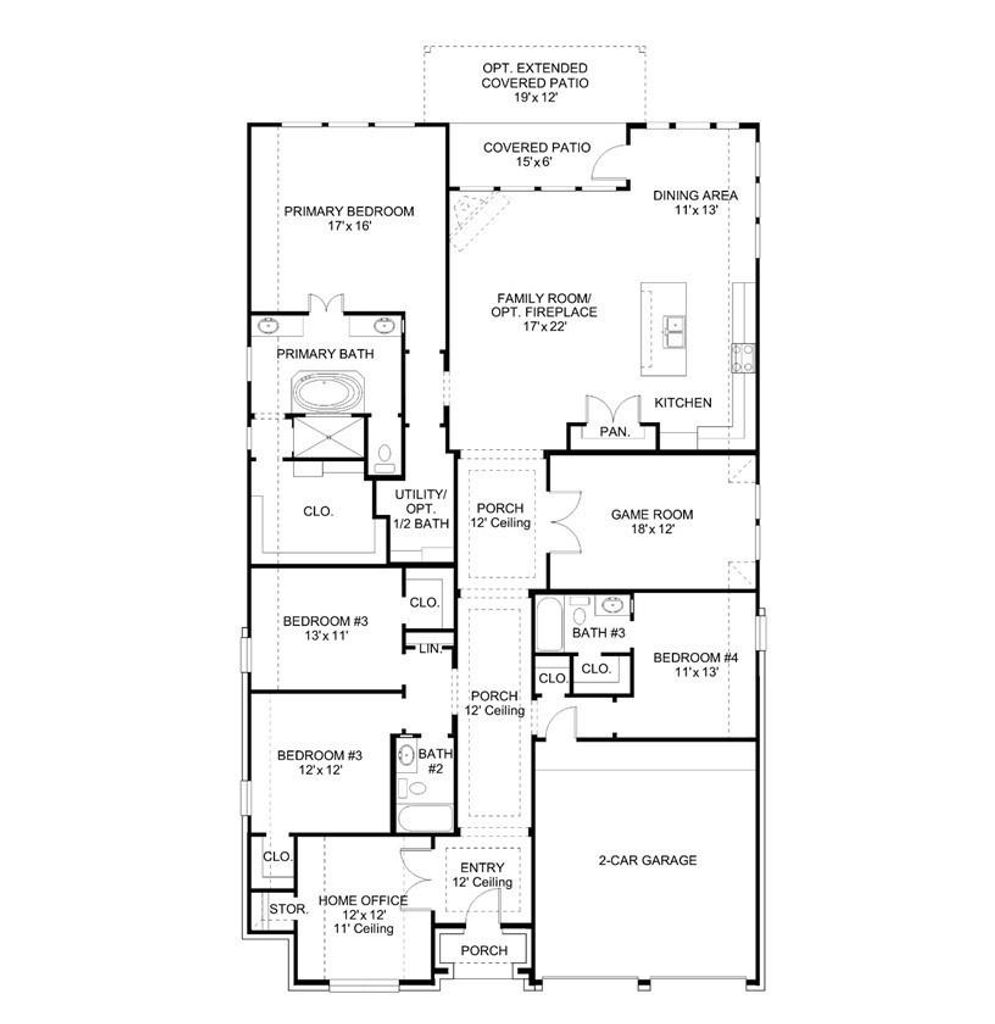 Home office with French doors set at entry with 12-foot ceiling. Game room with French doors off extended entry. Family room with wall of windows and a wood mantel fireplace opens to kitchen and dining area. Kitchen features walk-in pantry a 5-burner gas cooktop, and generous island with built-in seating space. Primary suite includes bedroom with wall of windows. Double doors lead to primary bath with dual vanities, freestanding tub, separate glass-enclosed shower and oversized walk-in closet. A guest suite with private bath adds to this four-bedroom home. Extended covered backyard patio. Two-car garage.