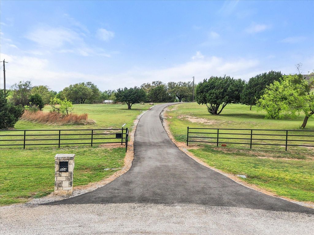 Discover this exquisite home where comfort meets style. Tucked away at the end of a cul-de-sac in a serene neighborhood, this home is perfect for those seeking tranquility. With its striking Austin Stone facade, this residence offers an enchanting appeal that continues throughout the property. Step inside to find a meticulously designed interior, boasting an open-concept living area with vaulted ceilings, expansive windows showcasing sweeping views and allows natural light throughout the home. The spacious living room serves as the heart of the home featuring a dramatic see-through stone fireplace that anchors both the living and dining area providing a cozy atmosphere ideal for relaxation and entertainment. The chef-inspired kitchen offers stylish countertops, a double oven and custom cabinetry. The primary suite feels like a private retreat, complete with a spacious walk-in closet and a stunning en-suite bath featuring dual vanities, a relaxing soaking tub, and a separate shower. A dedicated media room provides the perfect space for movie nights and entertaining, while a downstairs storm safe room with tornado straps adds an extra layer of security and peace of mind.Outside, your resort-style backyard is ready for both entertaining and everyday relaxation, offering a sparkling gunite pool with spa, a large covered patio, a gym*pool house*guest room, plus a storage room and workshop. Ample extra parking and an expansive driveway complete the setup. Enjoy five beautiful acres with mature trees—including a remarkable 200-year-old oak—along with frequent visits from deer and turkey. The property also includes a chicken coop, garden area, and full fencing throughout. Built with quality craftsmanship and thoughtful design, this exceptional home delivers the best of country living with stylish interiors and unforgettable outdoor amenities—well below current appraised value and ready to welcome its next owner.